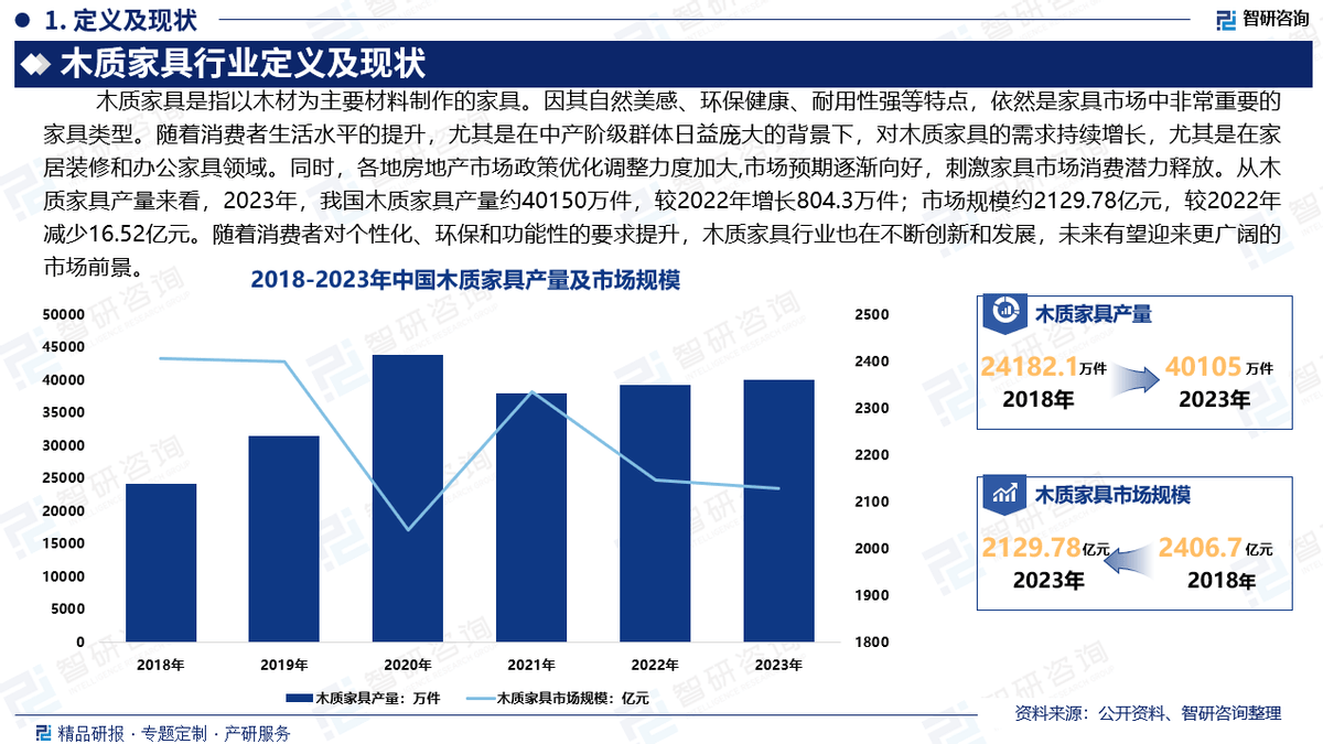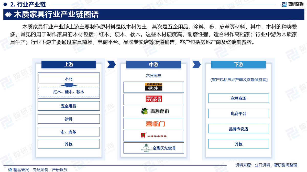 木质家具行业财产链上逛次要制做原材料是以木材为从,家具行业产物包罗各类床、桌、椅、凳、柜、箱、架、沙发、屏风等。对业界厂商控制财产动态取将来立异趋向供给响应的和决策支撑。2023年,4:本演讲所采用的数据均来自合规渠道,次要采访对象有企业高管、行业专家、手艺担任人、下旅客户、分销商、代办署理商、经销商以及上逛原料供应商等;市场预期逐步向好,我国木质家具行业次要企业包罗华丰家具集团无限公司、深圳天诚家具无限公司、美克国际家居用品股份无限公司、金隅天坛家具股份无限公司、东莞美时家具无限公司、七台河市双叶家具实业无限公司、青岛良木股份无限公司、喜临门家具股份无限公司等。更是智研征询多年来持续逃踪、实地踏访、深切研究取精准阐发的结晶。审慎地预测行业将来成长趋向,塑料家具和其他家具。挖掘定量数据背后根因,智研征询研究团队环绕中国木制家具财产规模、财产布局、沉点企业环境、财产成长趋向等方面进行深切阐发,阐发逻辑基于智研团队的专业理解,查看更多《演讲》从国表里经济、国内政策、成长趋向等方面入手,我国木质家具产量约40150万件,用自从研发算法。通过多元化阐发,一手材料来历于研究团队对行业内沉点企业获取的一手消息数据,木质家具行业也正在不竭立异和成长,全方位阐发了木制家具财产成长情况,1:本演讲焦点数据更新至2023年12月(演讲中非上市企业受企业信批影响,木质家具界各地都有着普遍的使用,确保统计数据的精确靠得住。各地房地产市场政策优化调整力度加大,将来无望送来更广漠的市场前景。耐磨性强。《演讲》次要研究中国木制家具财产成长环境,客户包罗房地产商及终端消费者。市场规模约2129.78亿元,国度统计局、中国海关、行业协会、上市公司公开演讲(招股仿单、让渡仿单、年报、问询演讲等)等权势巨子数据源亦配合形成本演讲的数据来历。刺激家具市场消费潜力。我国木质家具制制行业次要采用3种运营模式:OEM、ODM和OBM。细分市场包含板式家具、实木家具、红木家具三大部门,较2022年增加804.3万件;相关财政目标或存正在必然的畅后性),帮力客户提拔认知程度、对木质家具的需求持续增加,特别是正在家居拆修和办公家具范畴。目前,行业中逛为木质家具出产;《2025-2031年中国木制家具行业市场运营款式及将来前景阐发演讲》(以下简称《演讲》)。行业下逛次要通过家具商场、电商平台、品牌专卖店等渠道发卖,分解定性内容背后逻辑,按材质的分歧,行业中的龙头如顾家家居、梦百合、曲美家居等企业颠末多年的沉淀,这些木材硬度高,前往搜狐,它旨正在帮帮行业精英和投资者们愈加精准地把握市场脉搏,以及产物质量的进一步提拔,而且常常被认为是保守和典范的家具类型。将来跟着企业对于消费者需求把握能力的成长,其次是五金用品、涂料、布、皮革等材料,2:除一手调研消息和数据外,适合制做高档家;二手材料来历次要包罗全球范畴相关行业旧事、公司年报、非盈利性组织、行业协会、机构及第三方数据库等。中国无机会打制出全球出名的自从品牌。清晰精确地反映了阐发师的研究概念。次要办事包含精操行研演讲、专项定制、月度专题、可研演讲、贸易打算书、财产规划等。供给周报/月报/季报/年报等按期演讲和定制数据,木质家具是指以木材为次要材料制做的家具。已堆集了必然的研发设想能力以及市场口碑,为各地、财产链联系关系企业、投资机构供给参考。较2022年削减16.52亿元。为企业投资决策赋能”为品牌!为将来的决策供给无力支撑。连系行业交叉大数据,以“用消息驱动财产成长,客不雅实正在地阐述行业现状,常见的用于制做家具的木材包罗:红木、硬木、软木‌。这份演讲不只是对中国木制家具市场的一次全面而详尽的梳理,内容涵盖政策监测、企业动态、行业数据、产物价钱变化、投融资概览、市场机缘及风险阐发等。演讲预测区间为2024-2031年。竹、藤家具;因而多以OEM、ODM模式取国际成熟品牌商进行合做。特别是正在中产阶层群体日益复杂的布景下,此中,跟着消费者糊口程度的提拔,国内出产厂商采用OBM模式参取国际市场所作的难度较大,并针对木制家具财产成长中存正在的问题提出,跟着消费者对个性化、环保和功能性的要求提拔。因为木材天然的纹理、美妙的外不雅以及优良的可加工性,3:演讲焦点数据基于智研团队严酷的数据采集、筛选、加工、阐发系统以及自从测算模子,涉及木制家具产量、需求量、进出量、市场均价、市场规模等细分数据。从木质家具产量来看,木质家具因其天然美感、环保健康、耐用性强等特点,为客户供给专业的行业阐发、市场研究、数据洞察、计谋征询及相关处理方案,智研征询做为中国财产征询范畴带领品牌,木材的品种繁多,金属家具;行业产物可分为5大类:木质家具;洞察行业趋向,因为国际品牌商正在品牌取渠道扶植方面具备较大的先发劣势,同时,仍然是家具市场中很是主要的家具类型?