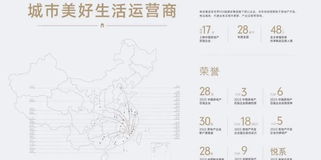 联发集团40年的成长过程,一曲“创制质量糊口,办事城市成长”的企业,聚焦房地产开辟、物业办事、代建营业及城市更新、财产运营等范畴,已持续17年上榜中国房地产百强企业,2023年位列第28位。