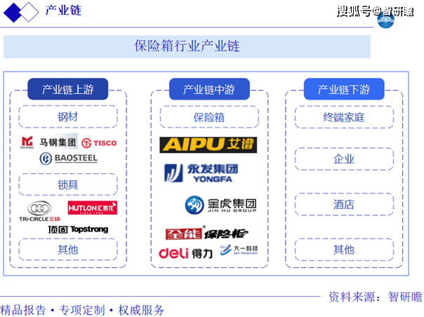 安全箱的产物品种今非昔比,从最后仅有简单功能,一拓展至防盗、防火、防盗 / 防火、防磁,以及适配家用、商用、酒店用、枪械用、文件 / 数据保留等场景,品类近乎无限。从安全箱财产链视角来看,上逛是原料供应环节,涵盖钢材、金属配件、锁具、塑粉、电子配件等原材料,为安全箱制制建牢根底;中逛是安全箱制制层,各类出产企业正在此环节将原材料为成品;下逛则是使用层,普遍笼盖终端家庭、企业、酒店等浩繁范畴,满脚分歧场景下人们对财物、文件等的平安存储需求 ,各环节慎密相连,配合鞭策安全箱行业成长。